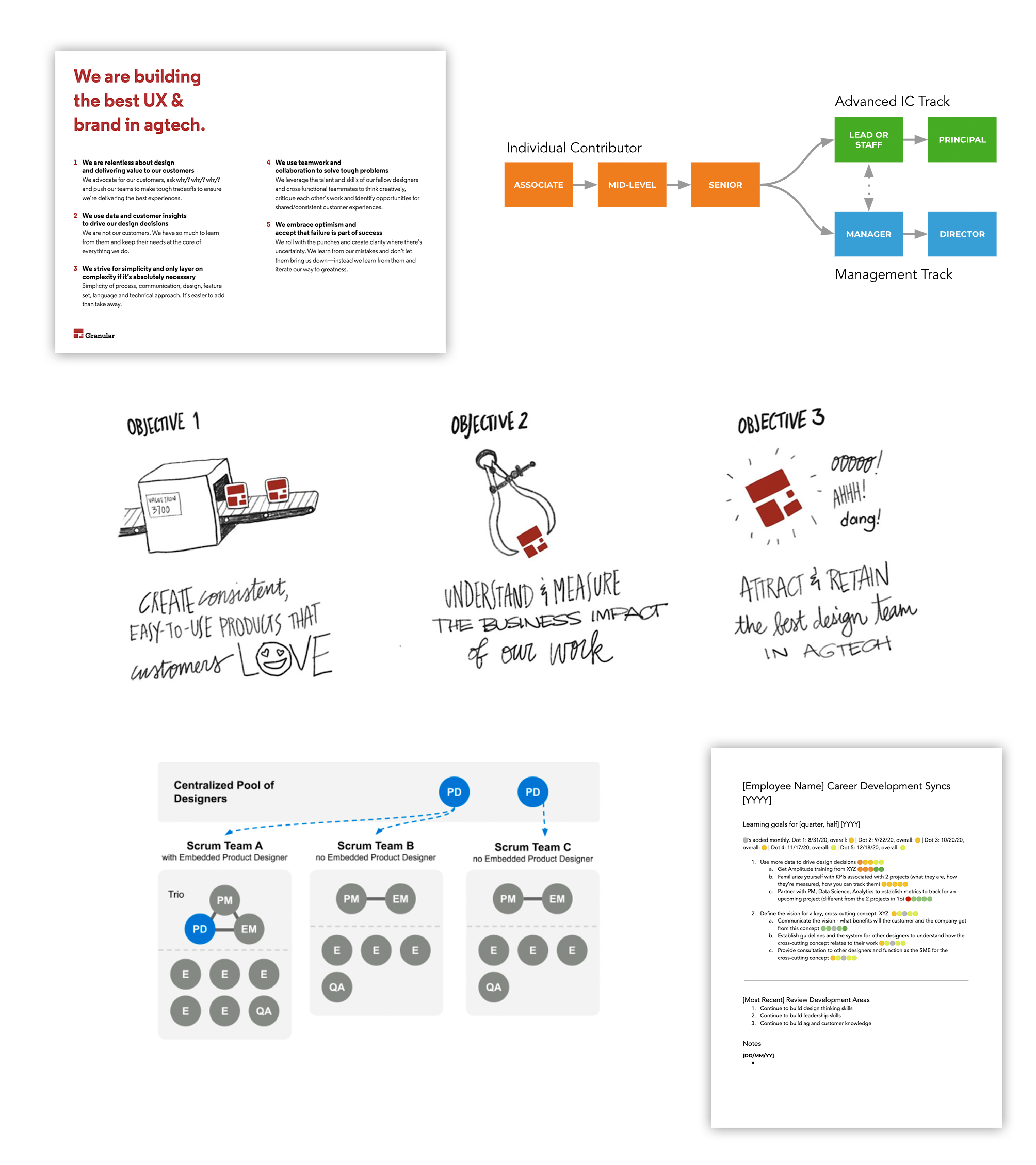 To mature and grow the Granular design practice, I created a suite of bespoke tools, tailored to the needs of the organization and industry. This included: hiring rubrics and interview guides, design team objectives and principles, a forked career ladder (created in collaboration with one of my leaders) that allowed ICs to advance without having to take a management role, regular career development syncs that every manager had with their direct reports to ensure a focus on employee growth, and countless other tools.